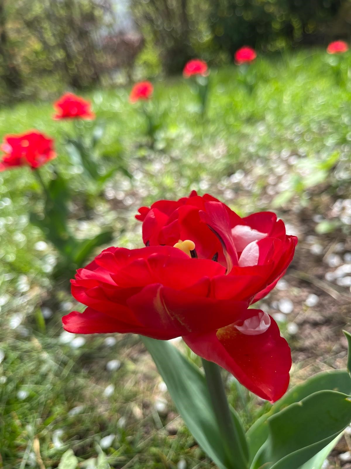 My husband made some soil beds near it and hung around there often. I planted a ring of tulip onions around it. When it was spring, up sprung bright red cups filled with pollen.
