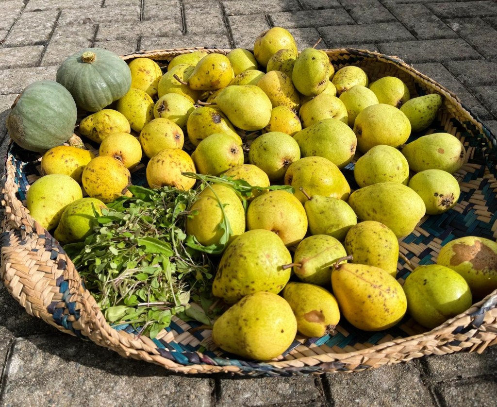 We picked the fruit right off the branches and ate every day. We shared, bottled, sundried to make chips, and even made chutney for friends. It was still too much. And so we piled up pears in a basket with a little note in german saying zum Mitnehmen, which meant take away, and left it outside for villagers. It was a joy to see the basket come back empty. It reminded me of the dansal culture in Sri Lanka.
